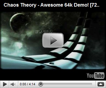 Ez, amit itt láttok a magyar Conspiracy csapat Chaos Theory nevű demo-ja. A futtatható program maga letölhető itt. A 2006-os Assembly verseny második helyét el is nyerték ezzel a srácok. Az egész nem több 64 kilobyte-nál és nem egy előre megírt dolgot tapasztalhattok: mindent abban a pillanatban generál és számít ki a program, amint futtatjátok a gépeteken. Őrületesen jó 3D-s látvány, agyszaggató profi drum and bass muzsika alatta: a programozás, komponálás, tervezés és kivitelezés csúcsa ez.